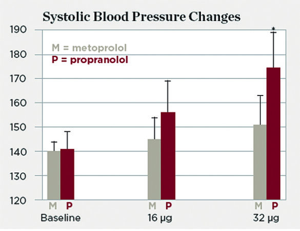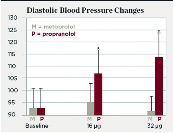 După cum ilustrează şi fig. 2, diferenţele din prisma tensiunii arteriale diastolice după infuzia de 16-μg de epinefrină au fost mai pronunţate, crescând cu doar 2mmHg în lotul tratat cu metoprolol şi cu 14mmHg în grupul cu propranolol. Diferenţa a atins nivelul de semnificaţie statistică (P < 0,05). Când s-a infuzat lent doza de 32μg de adrenalină, o cantitate uşor mai mică decât 2 ampule de soluţie anestezică de 1,7ml cu adrenalină 1:100.000 (34 μg sau 0,034 mg),47 grupul cu metoprolol a manifestat o creştere de 10mmHg în tensiunea arterială sistolică medie, în timp ce grupul tratat cu propranolol a prezentat o creştere medie a tensiunii arteriale sistolice cu 33 mmHg (P < 0,05). Tensiunea arterială diastolică a rămas neschimbată în grupul cu metoprolol dar a crescut cu 21 mmHg în lotul tratat cu propranolol (P < 0,05).54