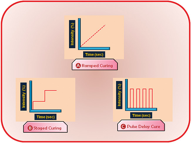 O metodă de a reduce stresul asociat contracţiei de polimerizare şi microscurgerilor constă în aplicarea iniţială a unei rate de polimerizare reduse.5 Aceasta poate diminua acumularea stresului prin asigurarea unei durate extinse pentru relaxarea stresului înainte de atingerea fazei de gel. Aceasta poate fi dobândită prin utilizarea unei tehnici de polimerizare soft start (debut slab) în care priza începe cu o intensitate redusă şi se termină cu o intensitate crescută,49 permiţând producerea conversiei maxime posibile după ce o mare parte a stresului s-a eliberat. Diferite aparate de fotopolimerizare oferă automat una sau mai multe secvenţe de expunere soft-start. Unele produc o putere de 100mW/cm2 timp de 10 secunde, urmată de o creştere imediată până la 600mW/cm2 timp de 30 secunde. Polimerizarea soft-start se divide în trei tehnici: sacadată, ascendentă şi cu puls amânat.2 (fig. 1).