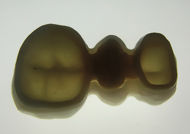 Abordarea prin faţete frezate implică fabricarea unui „ac despicat”; în cazul fabricării unei punţi cu contur total se creează două ace. Unul dintre ace se foloseşte la frezarea scheletului de zirconia, iar cel de-al doilea ac frezează dintr-un bloc dens o faţetă corespunzătoare cu contur total. Faţeta frezată este apoi lipită de scheletul de zirconia cu ciment pe bază de compozit răşinic (fig. 4, 5). Acest concept de frezare menţine mai departe posibilitatea de a elimina complet modelele fizice pentru punţile cu trei elemente. Combinarea amprentei digitale a preparaţiei, a dinţilor antagonişti şi a înregistrării ocluziei poate produce un model virtual în care contactele ocluzale adecvate sunt generate prin intermediul faţetei frezate. Astfel, nu este necesară nicio articulaţie fizică pentru a dezvolta contactele ocluzale corecte.