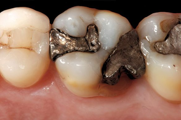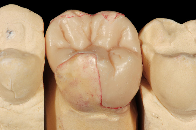 În fig. 1-7 este prezentat un caz al unui cuspid disto-palatinal fracturat la nivelul molarului 2.6. (fig. 1). S-a îndepărtat restaurarea existentă din amalgam, iar cuspidul disto-palatinal a fost inclus în forma preparaţiei dentare pentru onlay (fig. 2). S-a înregistrat o amprentă (fig. 3) cu material polivinil siloxan (PVS) şi s-a turnat un model din gips (fig. 4). Restaurarea onlay a fost creată din ceară pentru inlay cu duritate medie, a fost ambalată, presată, dezambalată şi adaptată pe modelul de ghips, iar în cele din urmă glazurată (fig. 5-7). Restaurarea definitivă a fost evaluată în preparaţia cavităţii în ceea ce priveşte potrivirea şi adaptarea marginală, apoi s-a cimentat cu ciment pe bază de răşină cu priză dublă.