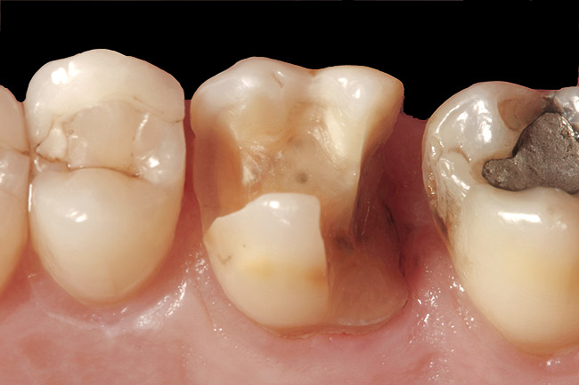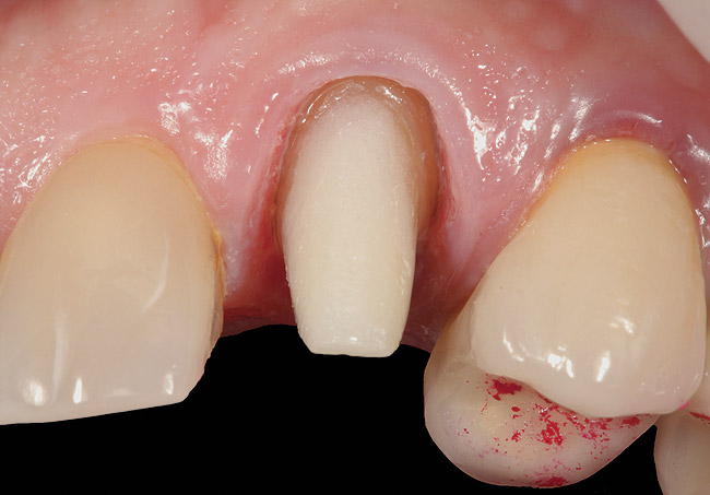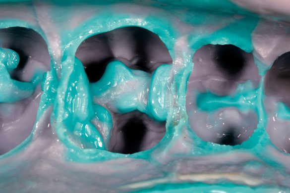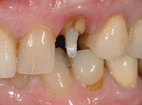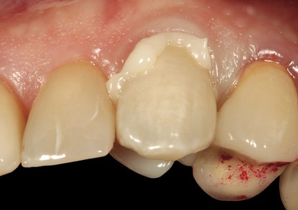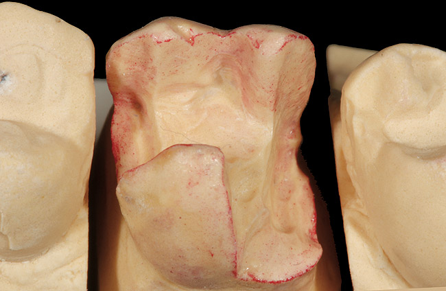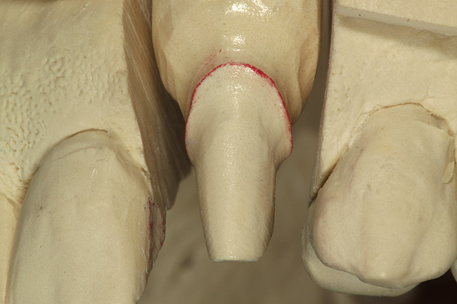 Restaurările unidentare cu acoperire totală sunt, de asemenea, indicaţii excelente pentru LDGC. Într-un caz separat, un pacient s-a prezentat cu un bont şi o coroană decimentată de pe dintele 2.3. (fig. 9). Pivotul din fibră era intact şi astfel s-a realizat noua reconstituire a bontului (fig. 10). S-a creat o preparaţie chamfer, s-a înregistrat o amprentă finală şi s-a fabricat o restaurare provizorie acrilică. Modelul a fost turnat din ghips pe baza amprentei, iar apoi a fost gravat (fig. 11).