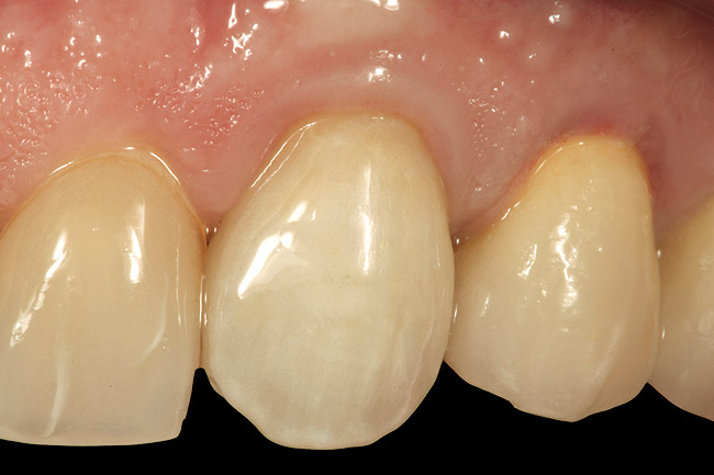 S-a aplicat şi s-a polimerizat un adeziv dentinar înainte de cimentarea definitivă cu un ciment pe bază de răşină autopolimerizabilă (fig. 13). După îndepărtarea cimentului s-a reevaluat ocluzia restaurării definitive (fig. 14) şi s-a efectuat o radiografie finală.