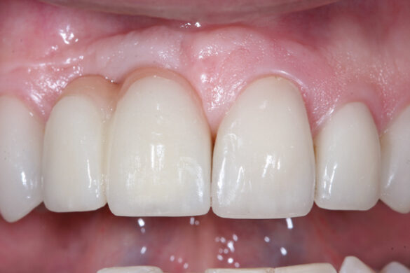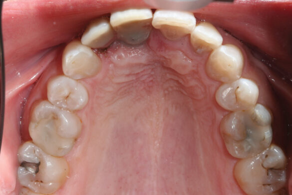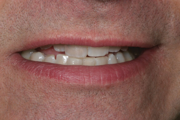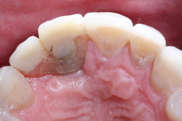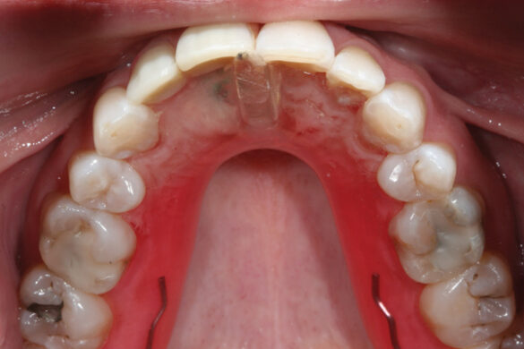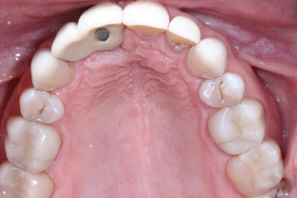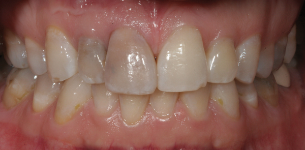 Antecedentele medicale nu relevă elemente importante de diagnostic. 1.2. şi 1.1. au fost trataţi endodontic, cu câţiva ani înainte, în urma unei leziuni produse prin accident sportiv. Pacientul relatează că terapia de canal a eşuat şi a fost necesară o intervenţie chirurgicală pentru tratarea unei infecţii. Acesta a primit profilaxie de rutină la intervale de 6 luni. La consultaţia iniţială, s-a observat că 1.2. este în linguoversie, iar 1.1. este coborât spre incizal comparativ cu 2.1. şi 2.2., precum şi faptul că prezintă o culoare mai închisă decât restul dentiţiei (fig. 2). Pacientul susţine că modificarea poziţiei dintelui a survenit pe parcursul anului trecut.