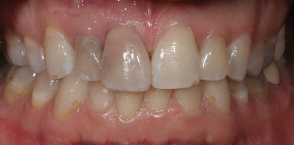 Pacientul, în vârstă de 43 ani, s-a prezentat la cabinetul dentar cu dorinţa de a trata doi dinţi frontali de culoare închisă şi cu anomalii de poziţie, care, după spusele pacientului, îi afectează calitatea vieţii şi îi submină încrederea în sine (fig. 1). Pacientul acuză durere în regiunea apicală a incisivilor lateral şi central din hemiarcada superioară dreaptă. De asemenea, raportează durere la masticaţie, atât pe partea dreaptă, cât şi pe cea stângă, precum şi ocazional la ingestia băuturilor şi alimentelor fierbinţi şi reci.