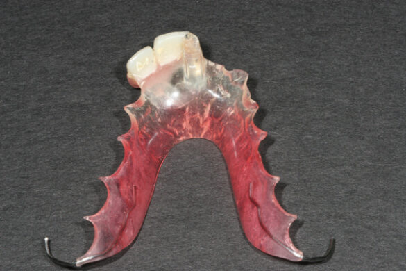 Pe durata procesului de osteointegrare, s-a confecţionat o a doua proteză mobilizabilă tranzitorie modificată astfel încât să fie utilizată drept deprogramator Kois (fig. 6, 7). După deprogramare, s-a efectuat o montare în vederea analizei funcţionale şi o echilibrare ocluzală în laborator. Informaţiile rezultate în urma analizei funcţionale au fost transferate în cavitatea orală şi s-a efectuat la nivelul întregii dentiţii o echilibrare ocluzală prin şlefuire selectivă cu scopul de a elimina disfuncţia ocluzală. Au fost stabilite la nivelul dinţilor posteriori contacte bilaterale, simultane şi de intensitate egală. Restaurarea caninilor superiori maxilari nu numai că a îmbunătăţit aspectul estetic al arcadei dentare, ci a creat şi contacte pe feţele palatinale ale caninilor.