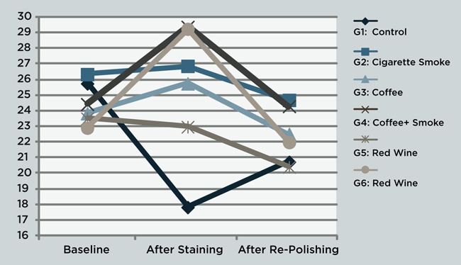 Potrivit rezultatelor, toate grupurile au prezentat modificări de culoare detectabile vizual, întrucât valorile ∆E* au fost mai mari decât la 3.3.12 Totuşi, doar specimenele expuse la cafea şi fum de ţigară, vin roşu sau vin roşu şi fum de ţigară au prezentat modificări de culoare diferite semnificativ faţă de lotul control. Deşi grupul control a demonstrat cea mai mică variaţie de culoare (∆E* = 8,19), după 21 zile de depozitare această valoare a devenit semnificativă clinic. Aceste rezultate coincid cu cele ale unui studiu anterior, care sugera o colorare extrinsecă mediată de salivă5. Autorii au speculat că efectul colorant al salivei se datorează probabil mucinei, o componentă a salivei artificiale utilizate în cadrul prezentului studiu.5