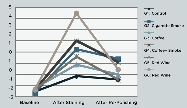 După etapa de colorare combinaţia dintre cafea şi fum de ţigară (grupul 4), respectiv vin roşu şi fum de ţigară (grupul 6) a produs un efect de îngălbenire mai pronunţat din punct de vedere statistic. Fumul de ţigară (grupul 2) şi vinul roşu (grupul 5) a demonstrat valori b* similare, comparabile cu cele iniţiale. Lotul control a prezentat valori b* reduse. Relustruirea a diminuat semnificativ aspectul gălbui al grupurilor colorate; totuşi, s-au consemnat diferenţe în privinţa valorilor b*. Valori medii crescute s-au identificat în grupurile 2 şi 4, urmate de 3 şi 6 şi în final la grupurile 5 şi 1 (fig. 2).