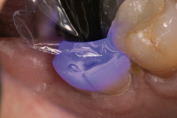 A existat o îngrijorare în privinţa contactului dintre adezivul care ajungea la banda de smalţ expus. Adezivul s-a fotopolimerizat timp de 5 secunde pentru a fixa stratul de adeziv la dentină (fig. 5). Pentru a elimina stratul inhibat de oxigen pe adeziv s-a aplicat un gel hidrosolubil şi s-a finalizat apoi fotopolimerizarea (fig. 6, 7). Pentru cazurile cu scanare digitală directă în care este implicată tehnica pulverizării pentru capturarea imaginii, după scanare poate fi şi mai dificilă eliminarea pulberii, dacă stratul inhibat de oxigen este încă prezent.