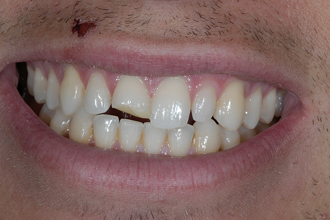 Pacientul, un bărbat în vârstă de 25 ani, s-a prezentat la cabinet după fracturarea incisivului drept superior în urma unei căderi accidentale. Pacientul prezenta, de asemenea, leziuni traumatice la nivelul buzelor şi relata o durere intensă în această regiune (fig. 1).