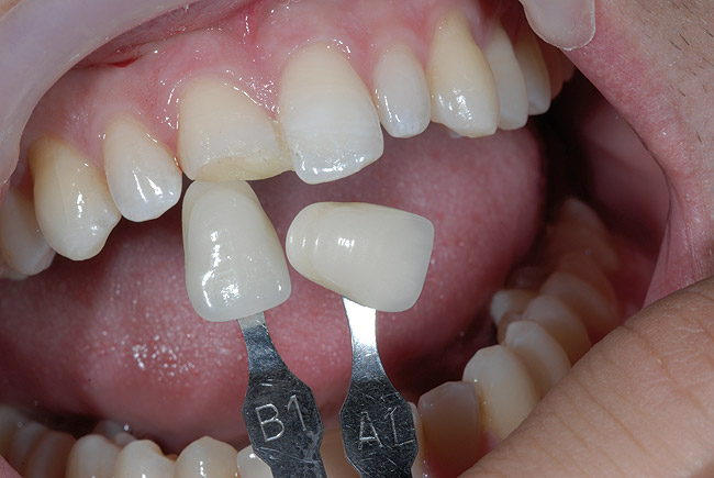 În cazurile precum acesta este importantă discutarea prealabilă a aşteptărilor pacientului în privinţa gradului estetic al restaurării finale. Dacă pacientul are aşteptări reduse şi un dinte monocromatic, cazul se poate finaliza utilizându-se o singură nuanţă body. Totuşi, în acest caz, profunzimea culorii, vitalitatea şi translucenţa necesară să mimeze dintele adiacent erau complexe şi au necesitat un mock-up cu nuanţe multiple.