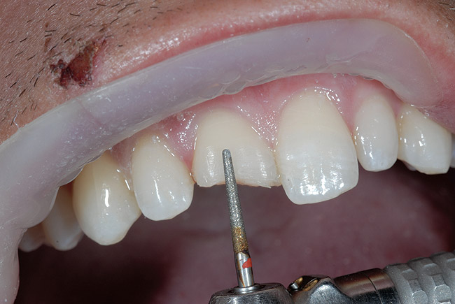Pentru a produce o trecere nedetectabilă între dinte şi restaurare, pe suprafaţa vestibulară s-a preparat un bizou, cu o freză diamantată fină şi ascuţită. S-a preparat un bizou infinit, după descrierea făcută de Fahl, începând cu 0,5mm în dentină şi continuată la 2 până la 2,5mm dincolo de linia de fractură, cu rotunjirea marginii preparaţiei (fig. 3).1,2 În cazurile de acest gen, pe versantul vestibular se poate utiliza şi un bizou stelat3; bizoul variază în lungime, profunzime şi volum, mimând un model stelat. În acest caz preparaţia orală a necesitat o preparare chamfer de 0,8 până la 1mm.3 Această masă de compozit va asigura flexibilitatea dintelui (fig. 4).