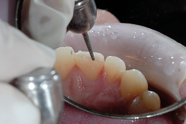 Dintele a fost microgravat şi clătit, s-a aplicat acid fosforic 37% timp de 15 secunde şi s-a agitat pe suprafaţă cu un aplicator dincolo de marginile bizoului infinit pe structurile dentare nepreparate. Dintele s-a clătit timp de 5 secunde şi s-a uscat uşor, lăsând o suprafaţă dentinară umedă. S-a aplicat adezivul şi s-a badijonat pe suprafaţă timp de 20 secunde, apoi s-a uscat 5 secunde pentru a îndepărta solventul apos pe bază de etanol. Aria s-a fotopolimerizat apoi timp de 10 secunde.