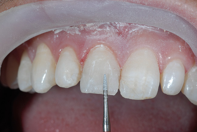Porţiunea orală a compozitului – inclusiv unghiurile liniei vestibulare incizale şi contactele proximale – a fost creată prin aplicarea compozitului alb pentru smalţ în interiorul matricei solide, aşezând matricea către dinte şi fotopolimerizând pentru 20 secunde. S-a îndepărtat matricea orală şi în urma analizei comparative cu dintele adiacent s-a decis că este necesară o opacitate suplimentară. De aceea, pe muchia incizală s-a aplicat un strat suplimentar din compozit alb pentru smalţ şi s-a polimerizat (fig. 5).