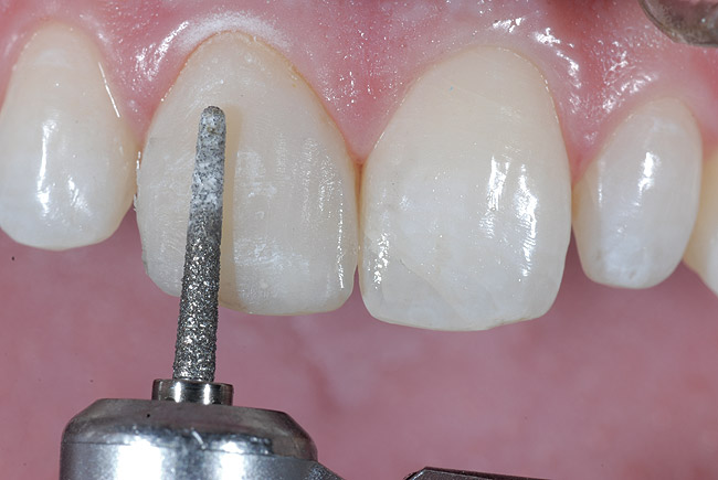 Anatomia secundară, care constă în unghiurile liniare şi suprafeţele de reflecţie, s-a conturat prin utilizarea frezelor diamantate fine. Unghiurile liniare ale unui incisiv central converg în mod tipic cu 10 până la 12mm de la joncţiunea smalţ-cement (fig. 7). Anatomia terţiară conţine gropiţele vestibulare majore, iar în acest caz cuprinde perichimata, care reprezintă liniile pe suprafaţa smalţului legate de striile lui Retzius. Acestea au fost create prin utilizarea unei freze diamantate dure, cu reducerea rotaţiilor pe minut la piesa de mână electrică şi trecerea frezei deasupra suprafeţei vestibulare într-o mişcare de pendulare (fig. 8). S-au utilizat discuri de finisare ca lustruire finală a suprafeţei vestibulare (fig. 9). Contrastul dintre starea preoperatorie şi restaurarea finală este descrisă în fig. 10, 11.