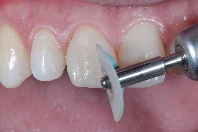 S-a realizat lustruirea şi conturarea pentru a asigura conturul anatomic corespunzător şi imperceptibilitatea dintre compozit şi segmentul de dinte fracturat şi incisivul central contralateral. Anatomia primară, care constă în profilul vestibular, forma conturului şi ambrazurile incizale, s-a perfecţionat prin utilizarea unui disc de lustruire şi finisare mare şi dur. Când se vizualizează din profil un incisiv central prezintă trei planuri; planul mijlociu este plat, iar planul incizal se înclină înapoi spre oral. Privit dinspre incizal, unghiul liniei incizale vestibulare trebuie să rămână cât mai aproape posibil de unghiul de 90 grade şi nu se rotunjeşte. Când se realizează aceste ajustări, este importantă evaluarea şi mimarea dintelui contralateral în toate perspectivele.