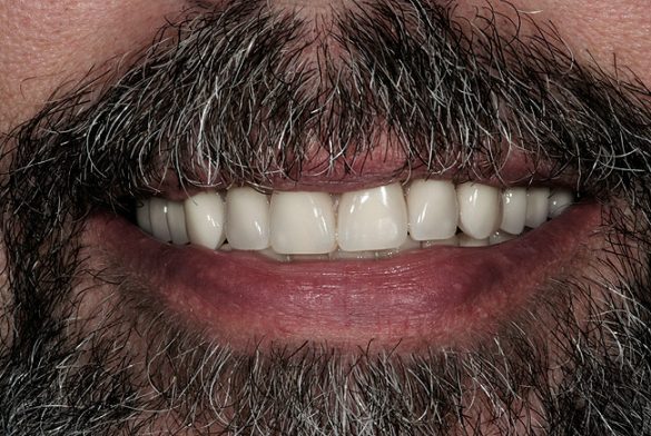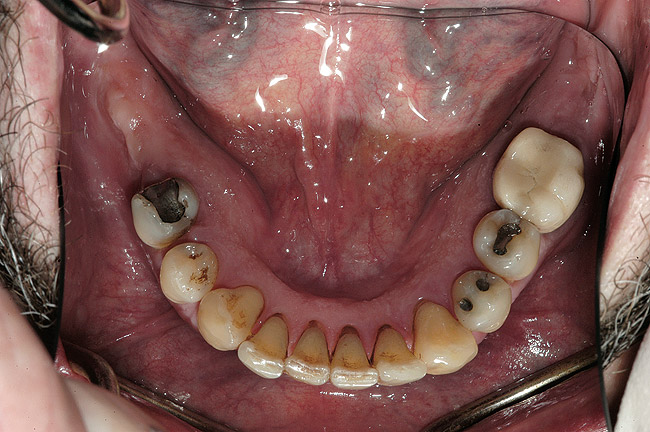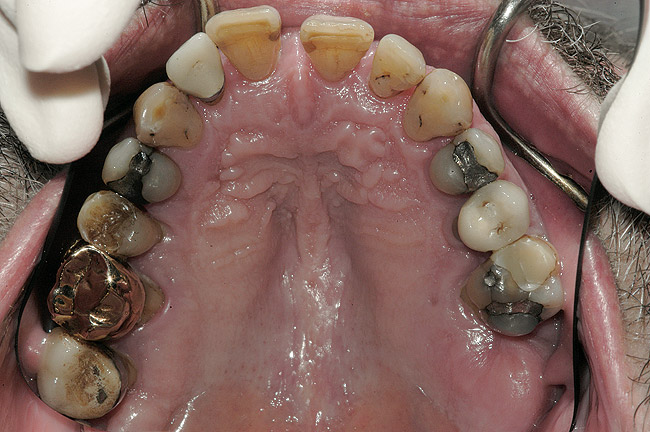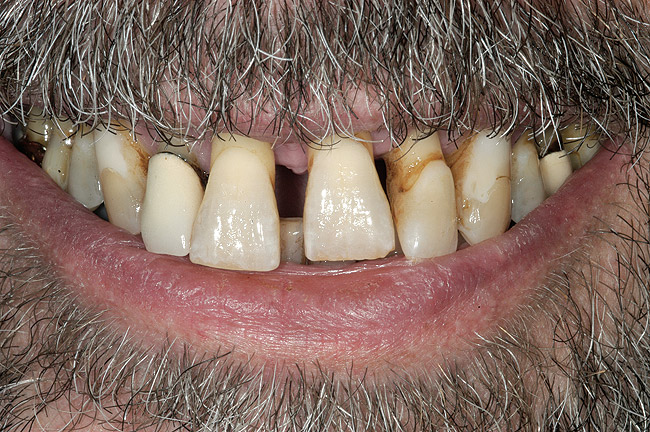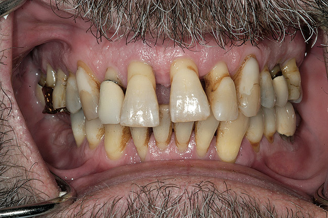 Un pacient în vârstă de 53 ani s-a prezentat cu îngrijorarea majoră privind aspectul, sensibilitatea şi mobilitatea dinţilor săi (fig. 1). El a răspuns pozitiv la chestionarul dentar referitor la sângerarea gingiei, dinţi dureroşi, sensibilitate la temperatură, gustul sau mirosul neplăcut al cavităţii orale, bruxism şi pierderea dinţilor.