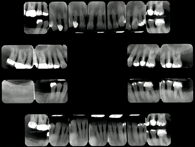 Pacientul a relatat că în ultimii 4 ani a vizitat cel puţin trei medici dentişti şi că se prezenta la şedinţe de întreţinere parodontală la intervale de 3 luni. Cel mai recent status radiologic se efectuase în urmă cu un an şi parodontologul îi recomandase proteze totale cu sau fără sprijin implantar.