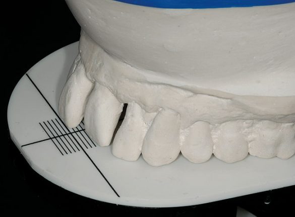 S-a conceput proteza provizorie imediată (fig. 6). Suprafaţa vestibulară a incisivului 2.1. era în poziţia orizontală dorită şi după scurtarea sa cu 3mm se afla şi în poziţia verticală dorită. Dintele 2.1. modificat a devenit apoi dintele „reper”, stabilind poziţia muchiei incizale. Laboratorului dentar i s-au oferit instrucţiuni pentru a înălţa dinţii superiori restanţi, menţinându-i la nivel cu poziţia scurtată a dintelui reper, cu întregirea planului ocluzal. Dinţii frontali inferiori au fost scurtaţi cu 2mm pe modelul diagnostic, stabilind poziţia muchiei incizale inferioare, iar laboratorul a fost instruit să închidă dimensiunea verticală de ocluzie cât era necesar pentru redobândirea contactului anterior dorit cu arcada superioară.