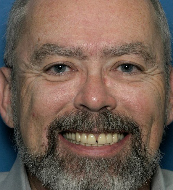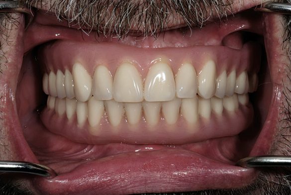 Pe perioada integrării implantelor s-au confecţionat proteze noi. S-a amprentat nivelul elementelor fixe prin utilizarea unei tehnici cu lingura deschisă. Înainte de proba machetei, proteza provizorie a fost modificată pentru a închide diastema, permiţând pacientului şi familiei acestuia să decidă dacă doresc menţinerea diastemei în proteza finală. Pacientul a optat pentru închiderea diastemei în proteza finală. S-a stabilit planul ocluzal final, plasat uşor mai inferior faţă de planul ocluzal al protezei temporare.