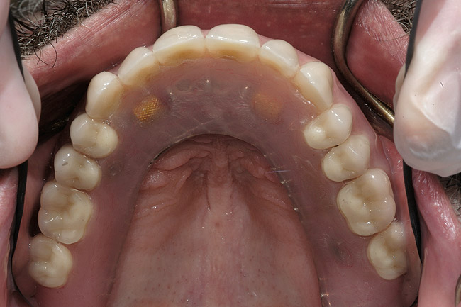 Proteza provizorie s-a apropiat extrem de mult de atingerea obiectivelor de ridicare a planului ocluzal pentru estetică şi repoziţionarea palatinală a incisivilor superiori (fig. 7). Încercarea de a eleva planul ocluzal a condus din punct de vedere estetic la situaţia în care planul ocluzal al protezei provizorii era superior faţă de acrilatul care acoperea tuberozitatea maxilară (fig. 8). În cursul perioadei de integrare, proteza provizorie a fost menţinută pe implanturile în curs de vindecare.