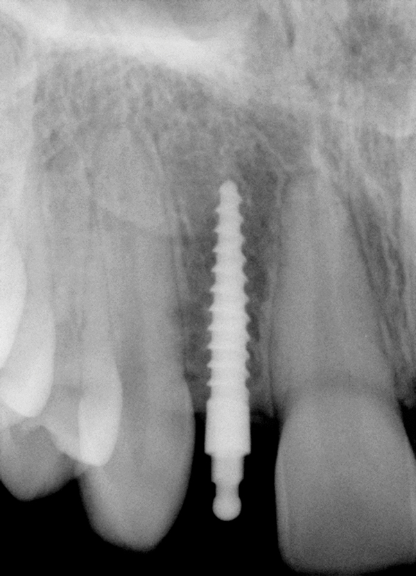 S-a plasat un MDI (fig. 15), radiografiile periapicale confirmând traiectoria adecvată a implantului. Pacientul a refuzat restaurarea provizorie din cauza costului implicat. S-a fabricat o coroană PFM finală și s-a cimentat cu rășină. După 8 ani de funcționare a MISFR, pacientul nu a raportat nicio complicație.