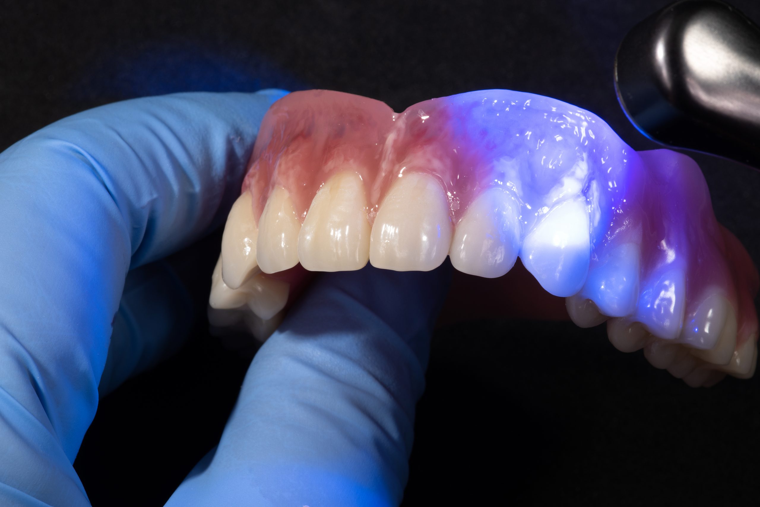 După fiecare etapă s-a efectuat polimerizarea intermediară în cuptorul foto pentru a asigura fixarea culorilor de pictură înainte de aplicarea substanței următoare. După caracterizarea întregii suprafețe cu VITA AKZENT LC GLAZE, proteza s-a introdus în cuptorul foto pentru polimerizarea finală.